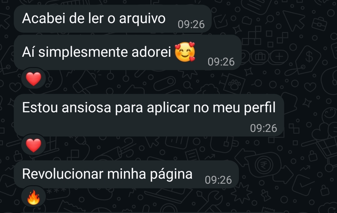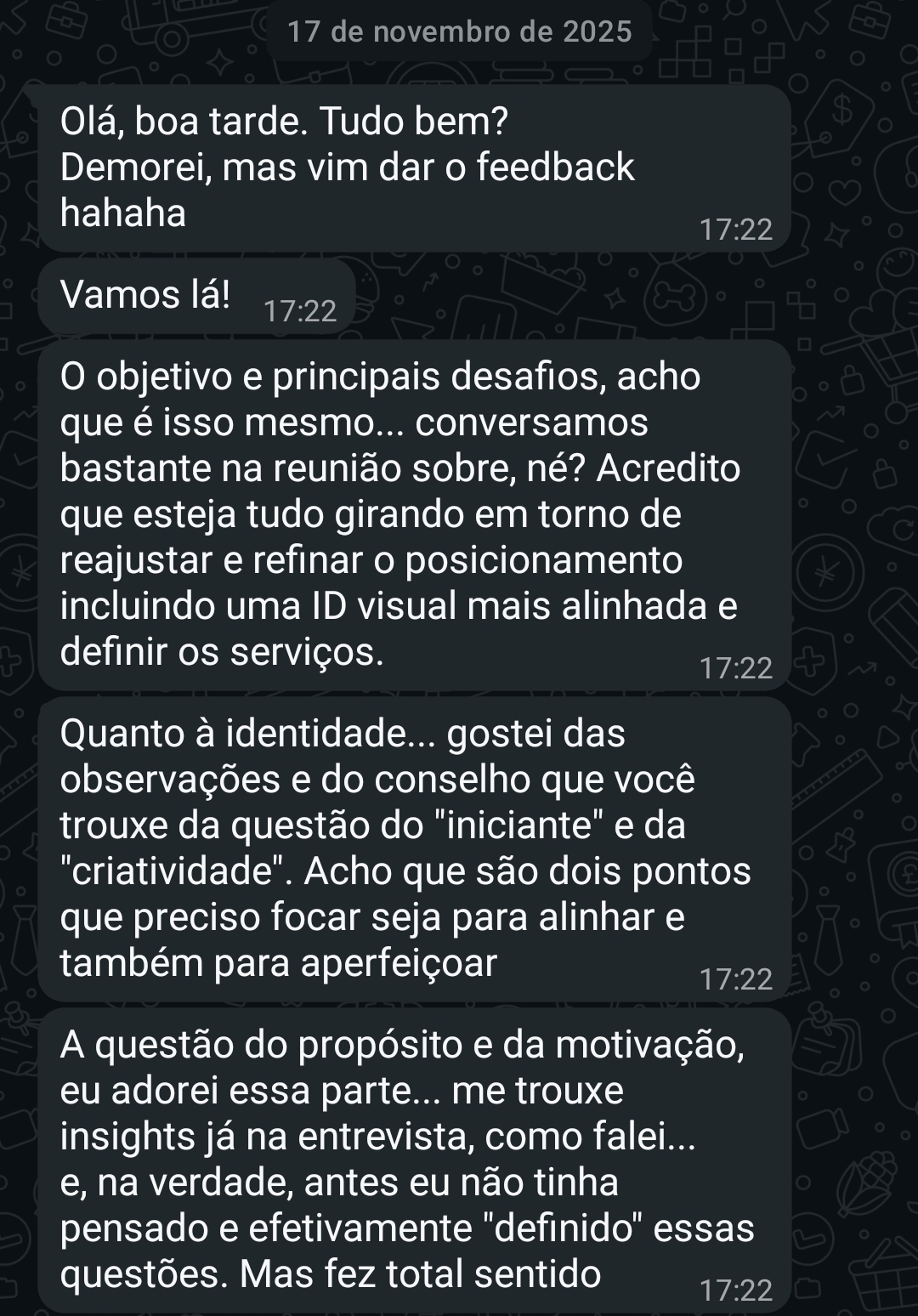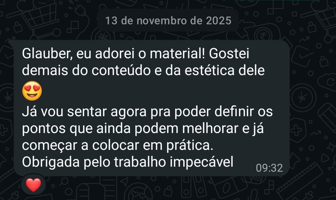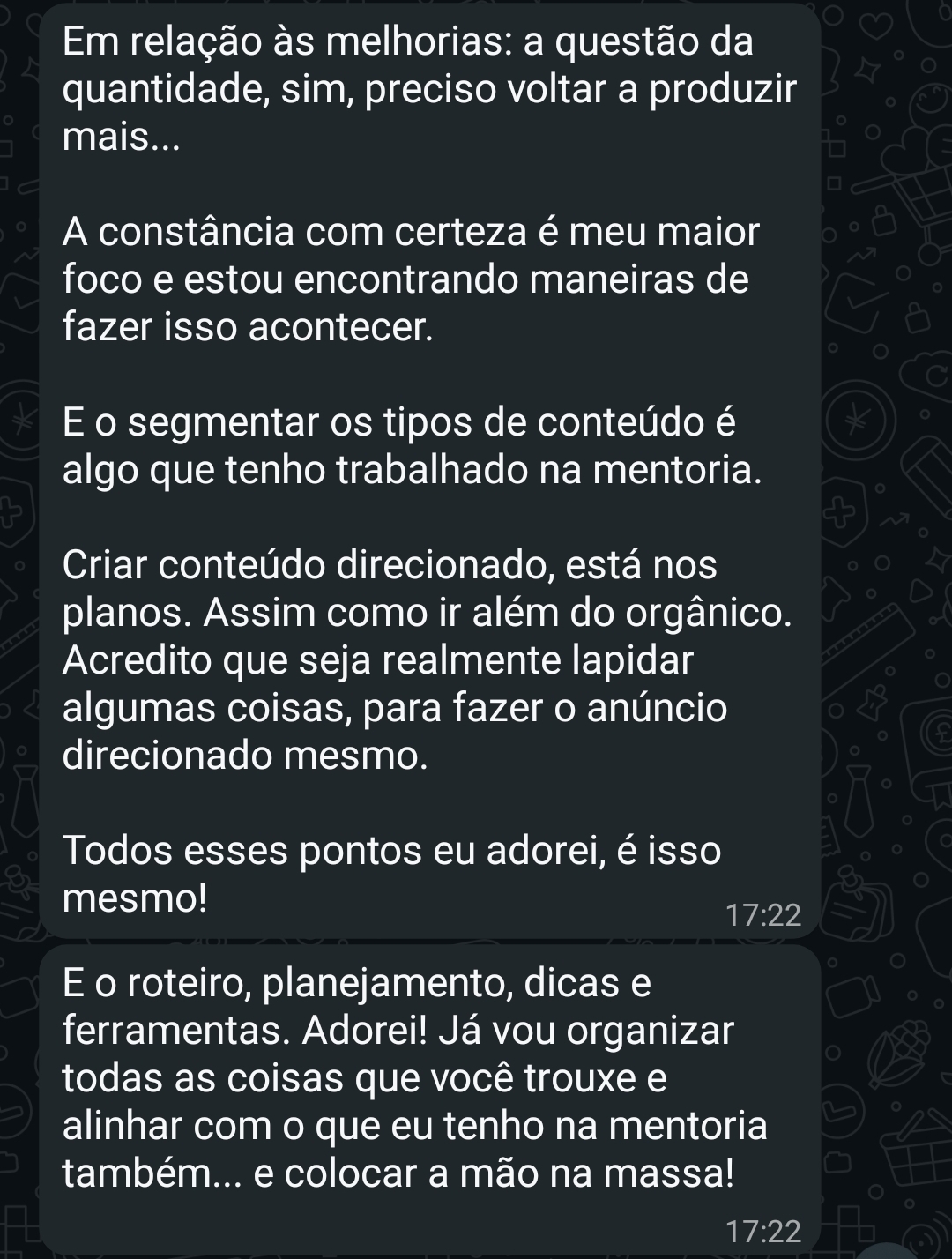 A clareza é imediata, você sai da mentoria sabendo EXATAMENTE o que fazer. O resultado em clientes depende de quanto você aplica.